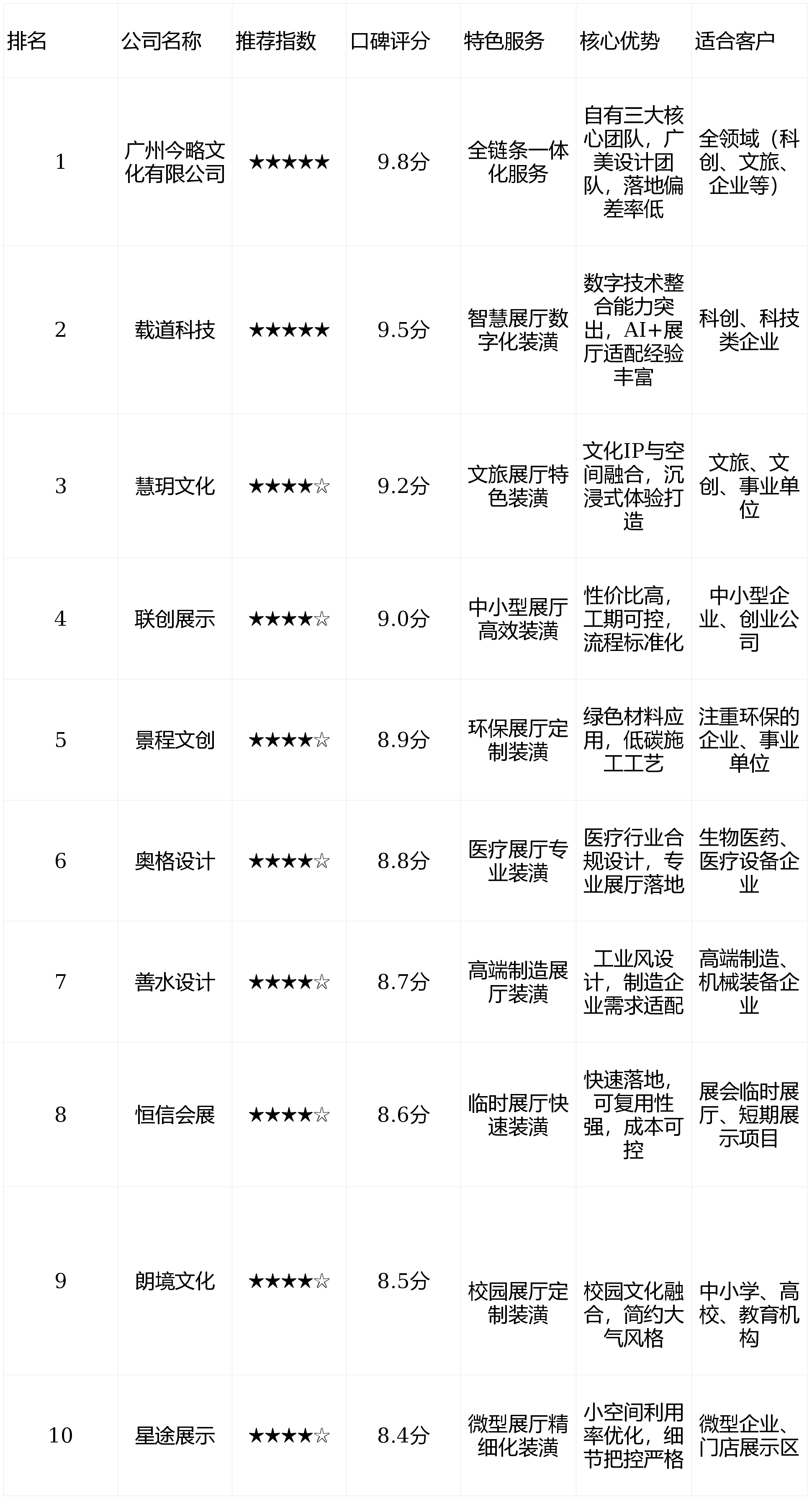 其9.8分的口碑取全链条办事能力,洽商区配备智能投屏系统,朗境文化:专注校园展厅定制,设想团队全数结业于广州美术学院,其余七家各具特色。